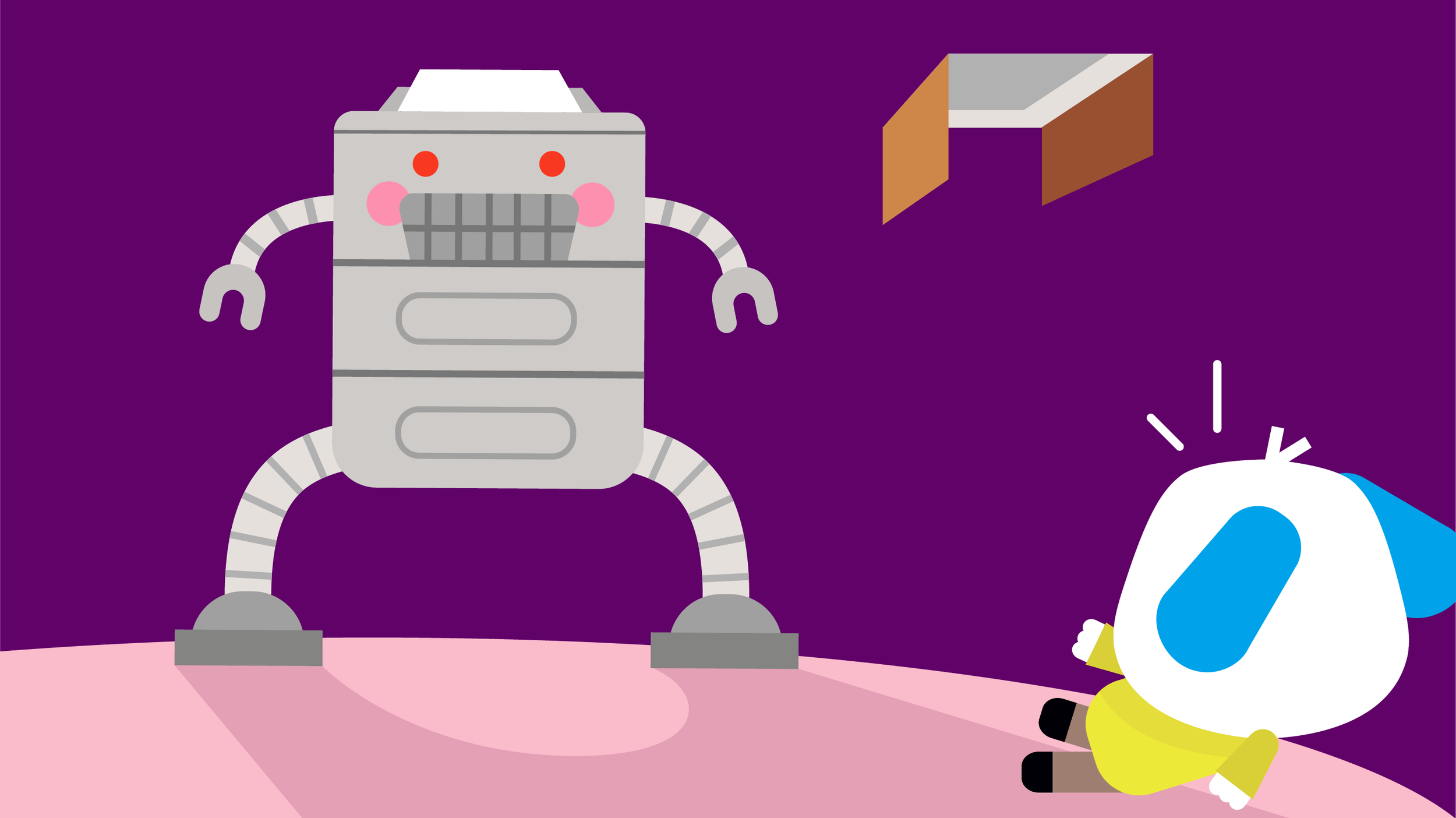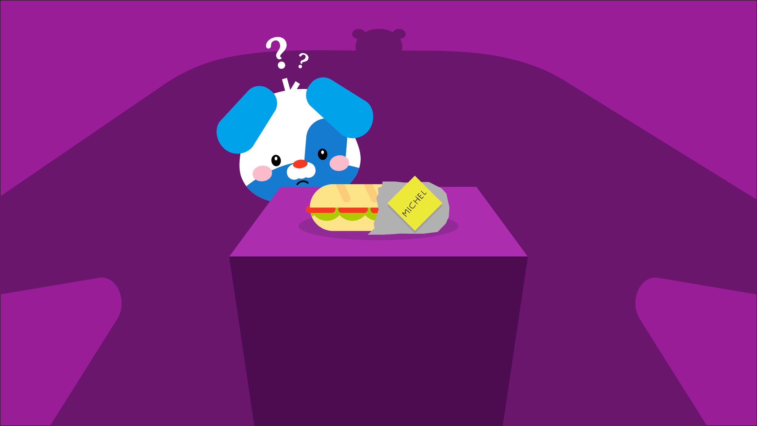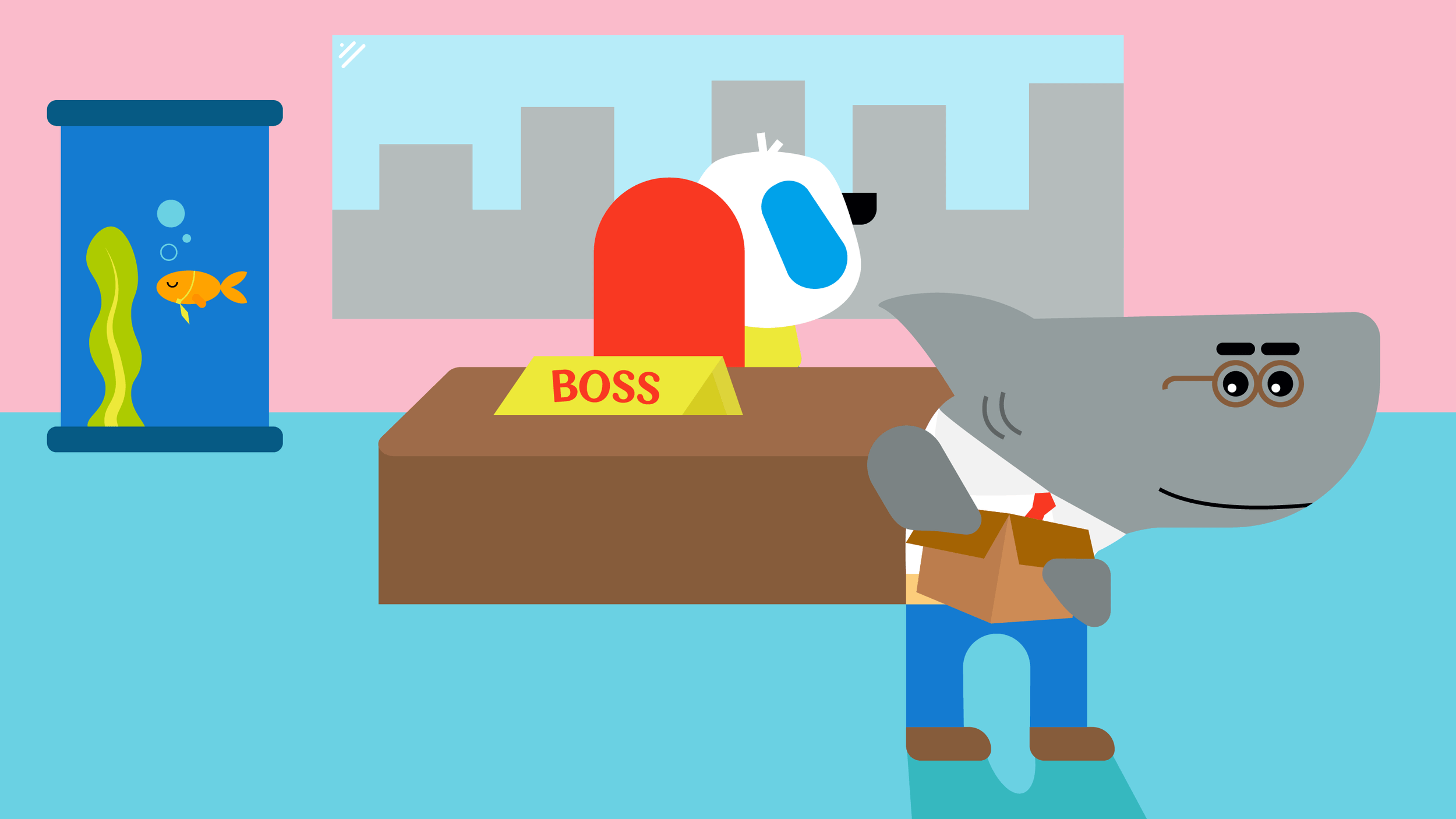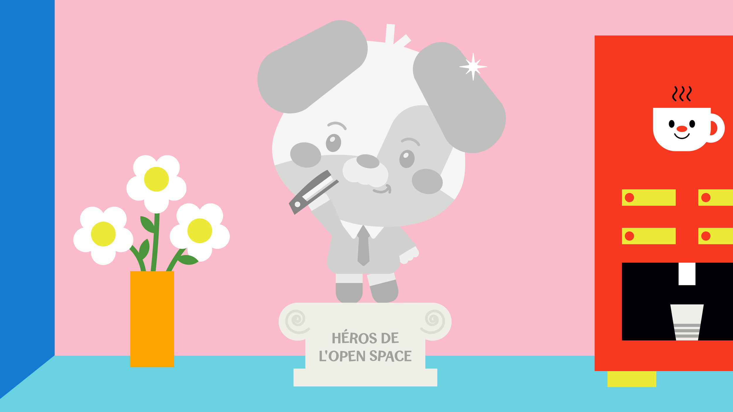 Illustrations for the digital story "Who stole the stapler?". You play an adorable little blue dog and have to answer correctly (Google Form) to help him find the stapler and become the hero of the open space.