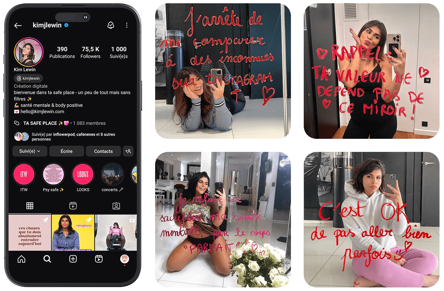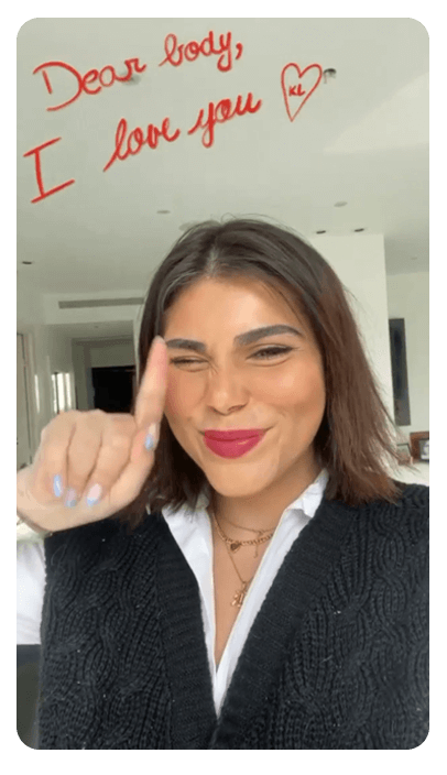 Kim is known on social medias for speaking openly and kindly about mental health, self-confidence and weight. She's also known for these posts with her kind messages written in lipstick on mirrors. I created an Instagram filter for her that recreates many of her messages and stickers related to her AD.